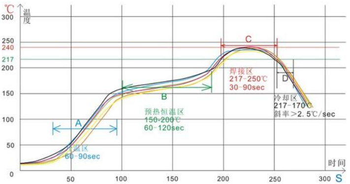 1,分析曲線:首先拿到客戶要求的曲線圖,如果沒有需參照錫膏供應(yīng)商提供的曲線圖,然后分析其溫度曲線升溫區(qū),恒溫區(qū),焊接區(qū),冷卻區(qū)各個溫區(qū)的峰值及持續(xù)時間。