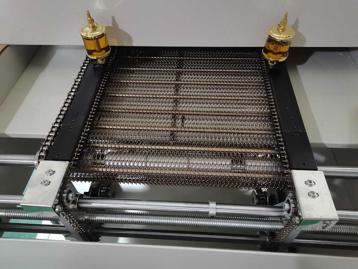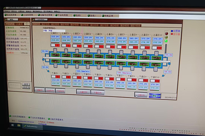 2022年2月16日深圳某客戶采購我司大型十溫區回流焊用于醫療級鍍金產品通孔焊接,該產品使用實心鋁治具裝載,吸熱量極大,且非常重,對PCB板通孔插針上下位置焊接使用10倍顯微鏡檢查必須圓潤飽滿,光亮,實際溫差±1℃。針對產品的高要求,工程部設計為承重網帶傳動,承重280KG,并使用5mm存熱板氧化處理設計,滿足客戶的需求。