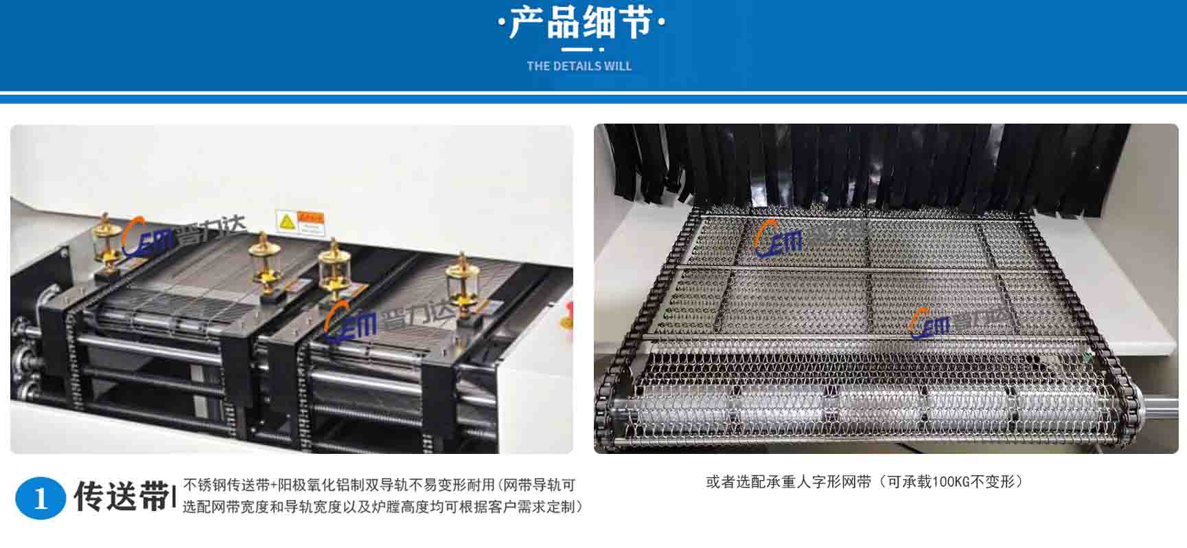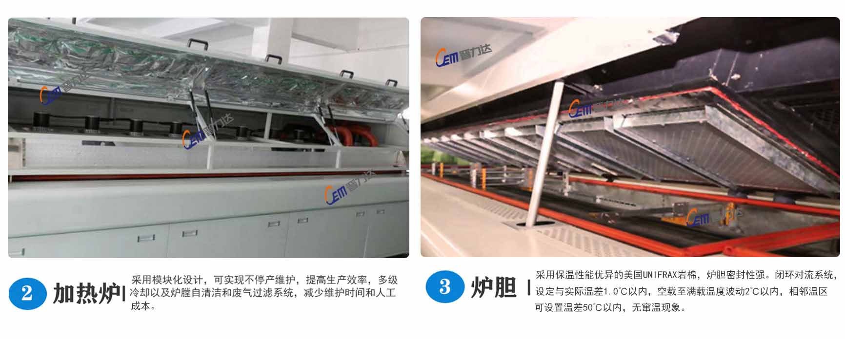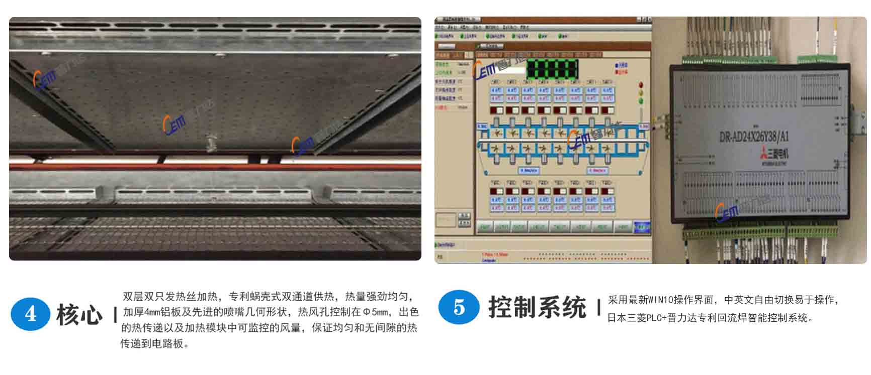 ● 各溫區采用雙熱風通道強制獨立循環,獨立PID控制,上下獨立加熱方式,使爐腔溫度準確,均勻,熱容量大;雙熱風通道加熱方式, 解決了回流焊焊接時的死角難題.適合CSP、BGA、0201CHIP等電器元件的焊接.